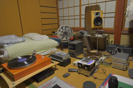 そんな訳で今年の初め頃には、しばらく休眠中だった金田式ターンテーブルを始め、持ち込む機材が、最大限まで行かなくともそれに近い状態にまで増え、畳の上に所狭しと散らばるようになってしまいました。まるでおもちゃを床いっぱいに広げて遊ぶ子供の体ですが、こんなオーディオもなかなか楽しいですよ。この部屋はときどき他のことにも使われるので、そのときには全部片付けなくちゃいけなくて大変なのですが。